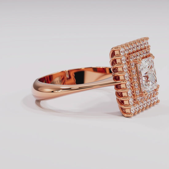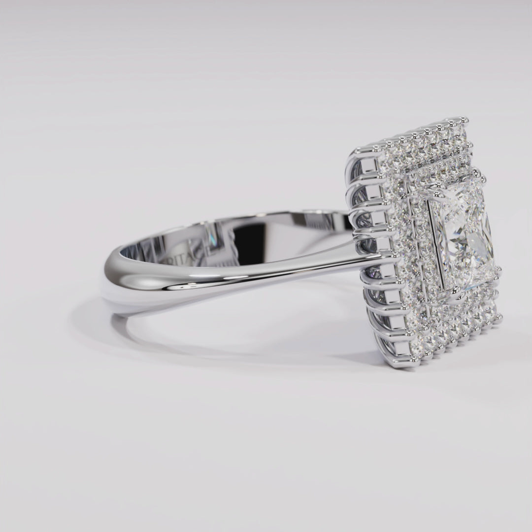 This ring was made to shine — quietly but clearly. At the center sits a 1.01 ct diamond, cut with care and set in a clean, square design. A fine halo of pavé diamonds (0.48 ct) surrounds it, catching the light without stealing the show. Everything is set in 18k white gold, built to last and made to feel right from the first moment you wear it.