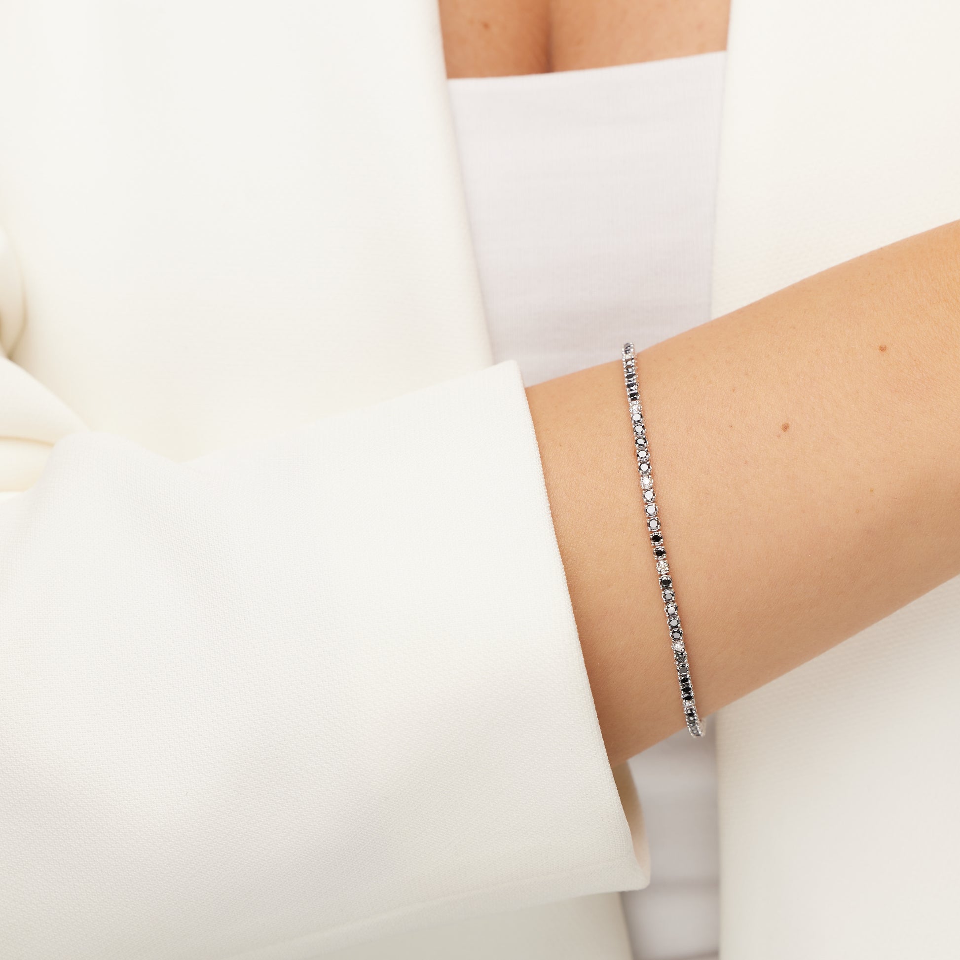 Alternating white and black diamonds bring a quiet contrast to this refined tennis bracelet in 18kt white gold. The subtle play of light and shadow feels contemporary yet timeless. Wear it solo for a clean statement or layered for a touch of intrigue.